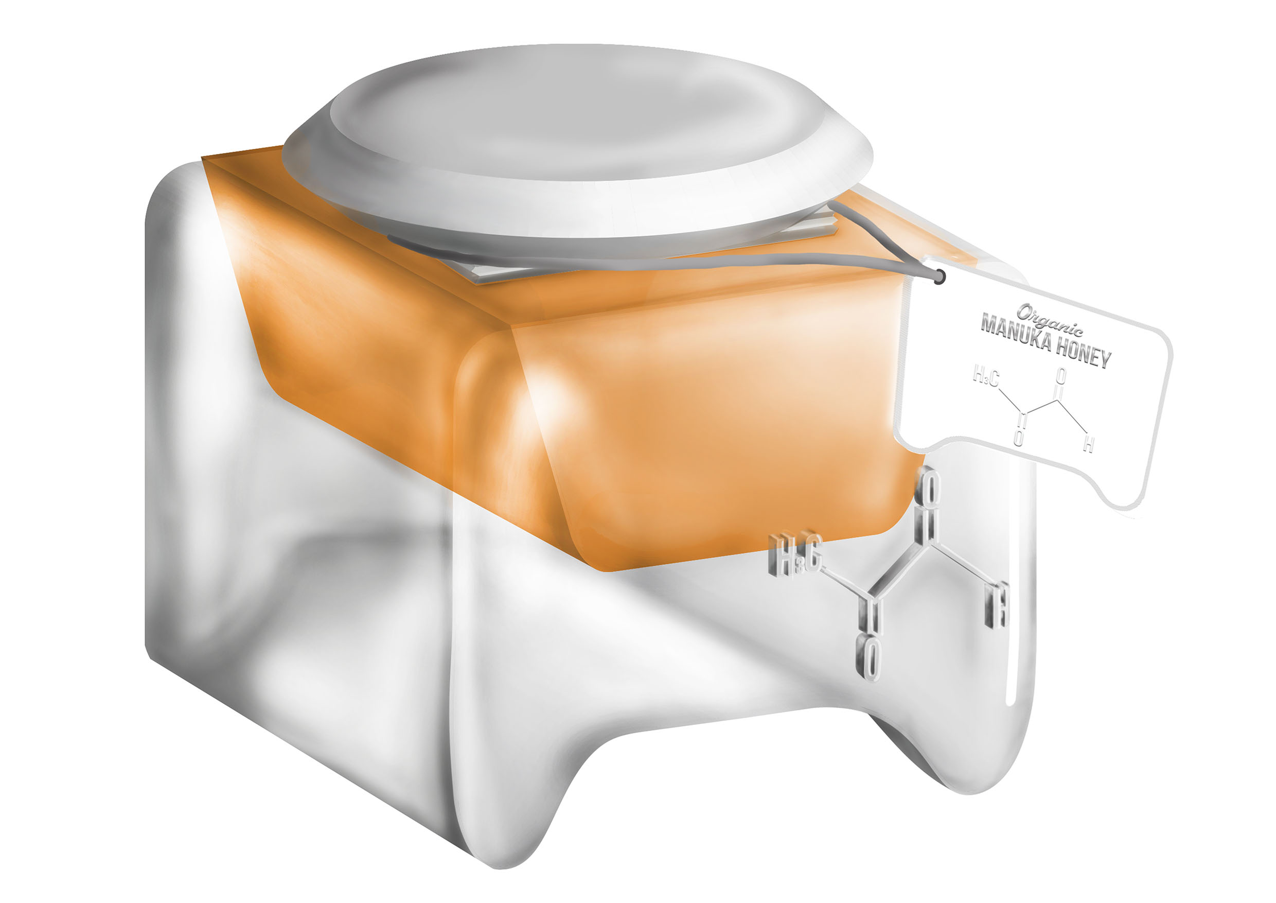 Research led me to discover that manuka honey contains many healing properties, so for my premium packaging, this was the aim of the design; to create smaller units, so that the product would not deteriorate before it is used up, since you only require small quantities. I designed futuristic, bespoke, interlocking jars as this would enhance their appeal when competing on the shelf and also help to utilise the available space.