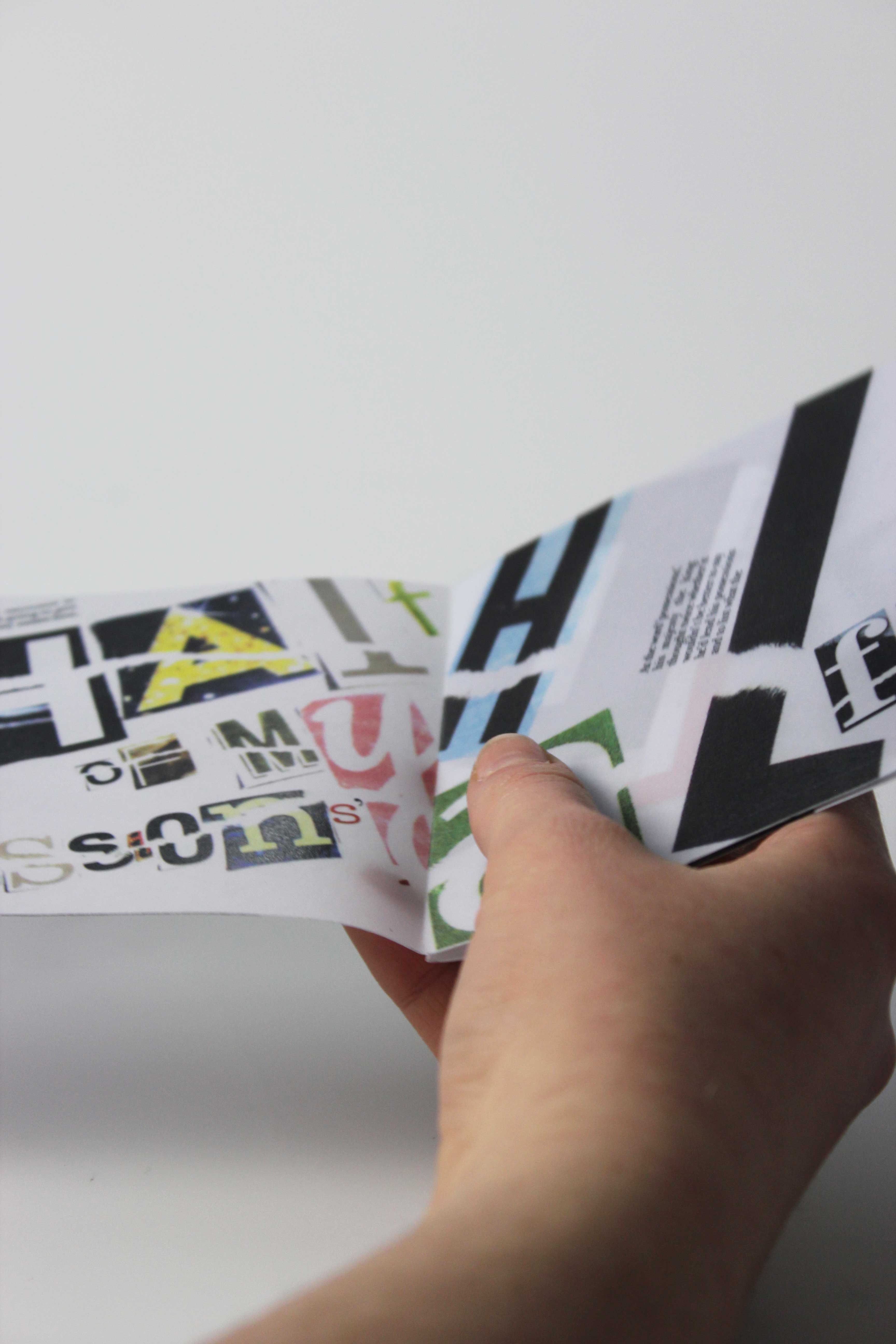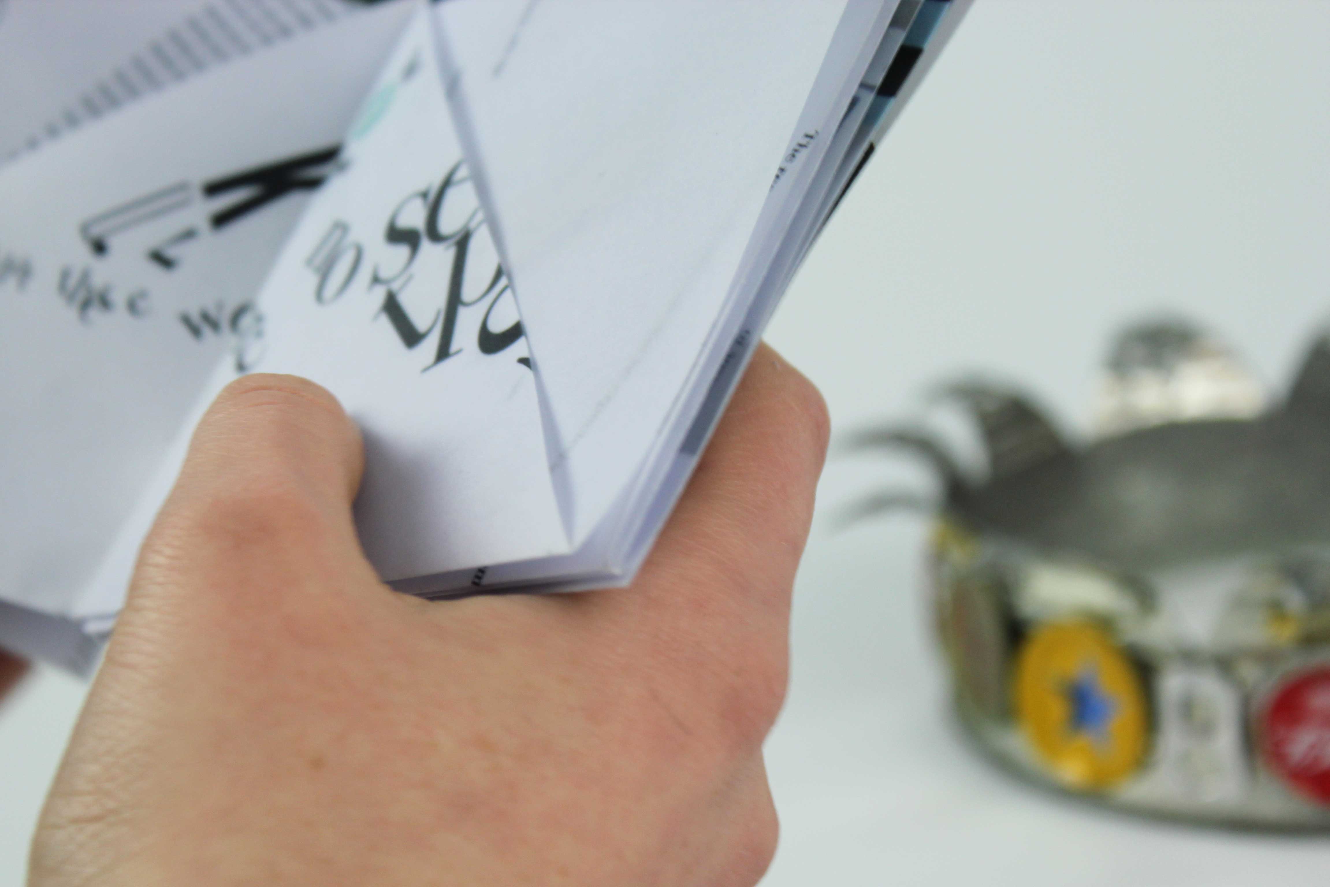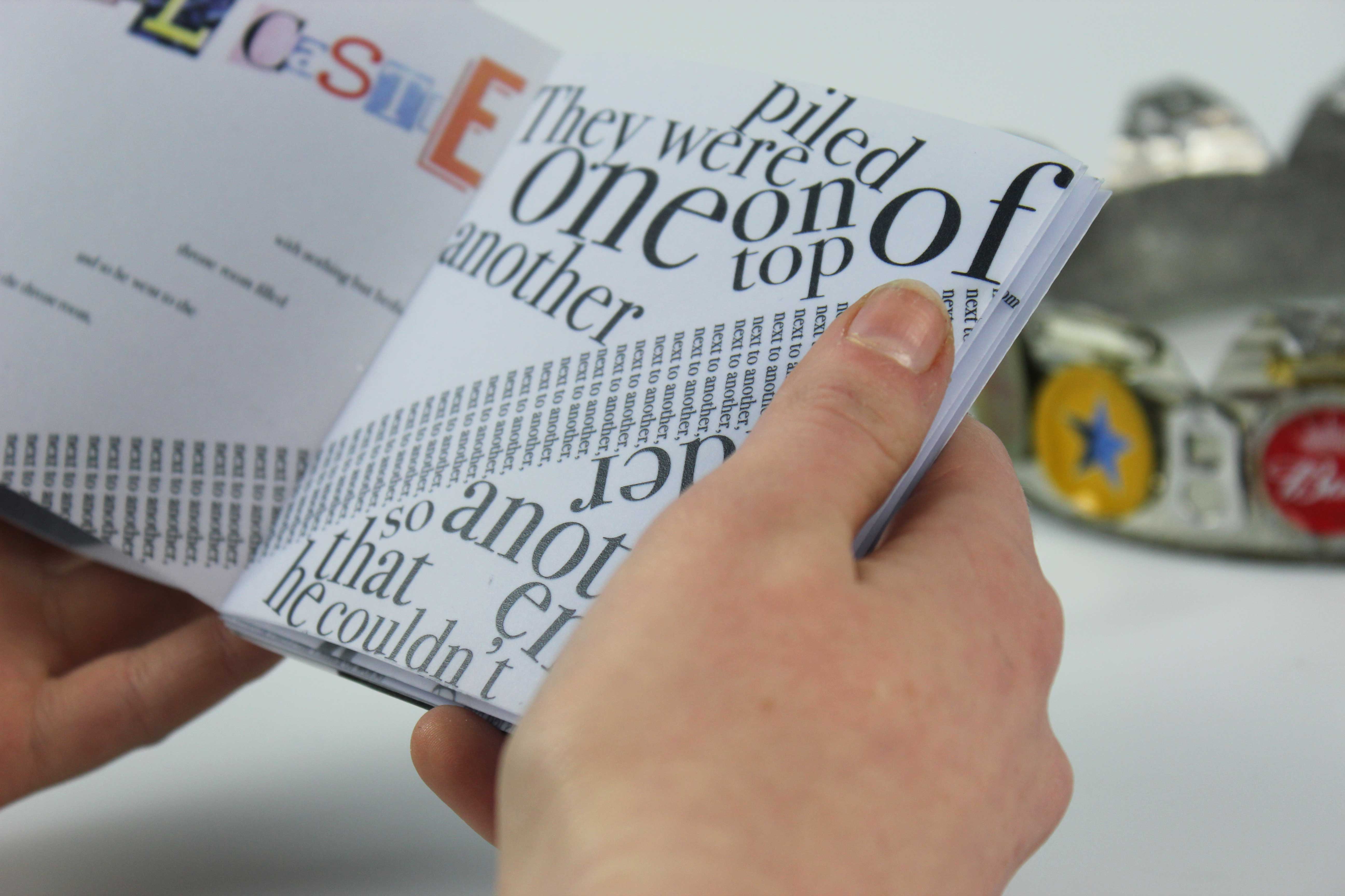 The text was arranged in an intentionally playful manner following the progress of the story. This time I used semi-transparent tracing paper which added to the overall confusion that would be experienced by anyone attempting to read it. Whilst the overall typography reinforced key words and phrases, its unique layout ensured that the reader would need to immerse themselves fully by twisting and turning the book in order to reach the conclusion.